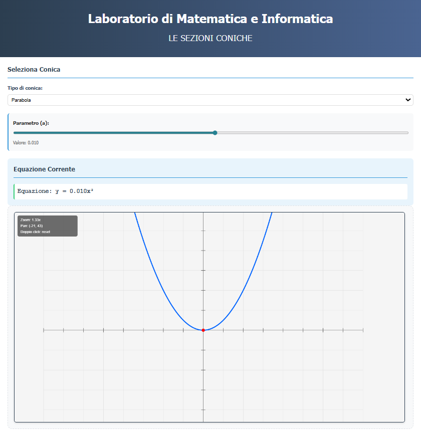 Realizzare una pagina web interattiva che tracci una conica scelta dall’utente. L'interfaccia deve presentare degli slider per modificare i parametri e un canvas che aggiorni in tempo reale il grafico